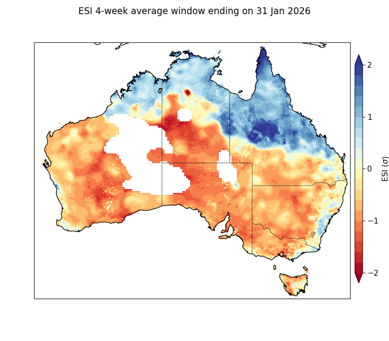 Evaporative stress for the 4 weeks ending 31 January 2026 was elevated (negative Evaporative Stress Index (ESI)) in: