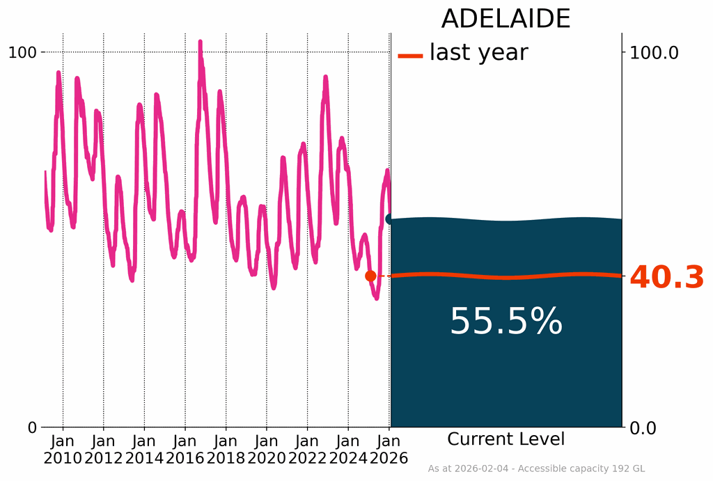 Adelaide’s storages were 55.5% full at the end of January, a decrease of 8.2% from the previous month, but 15.2% higher than at the same time last year. Most of the storages in Adelaide remained above or close to 60% capacity except South Para at 43.0% capacity, Warren at 39.5% capacity and Mount Bold at 48.9% capacity. Storages increases were driven by operational factors, inflows from the River Murray and local catchment runoff.