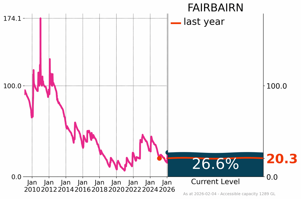 Fairbairn increased by 10.9%, finishing the month at 26.6%. This increase at Fairbairn raised the volumes in the Nogoa-Mackenzie system to 26.6% of capacity in January. This system supplies water to rural communities across central Queensland. Lake Awoonga had a small increase, 1.4% in January ending at 35.1%, 0.9% higher than at the same time last year.