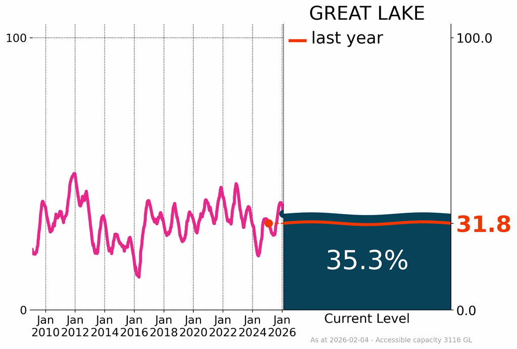 In Tasmania, the two largest storages—Lake Gordon and Great Lake—were at 64.5% and 35.3%, respectively, at the end of January. Total storage across Tasmania was 68.4%, a decrease of 2.6% from December, but 4.4% higher than this time last year.