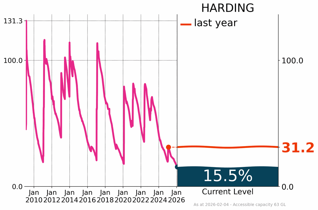 The Harding Reservoir, the only major storage in the Pilbara–Gascoyne drainage division, was at 15.5% of capacity at the end of January, a slight decrease of 1.2% from the previous month, and 15.7% lower than at the same time last year.