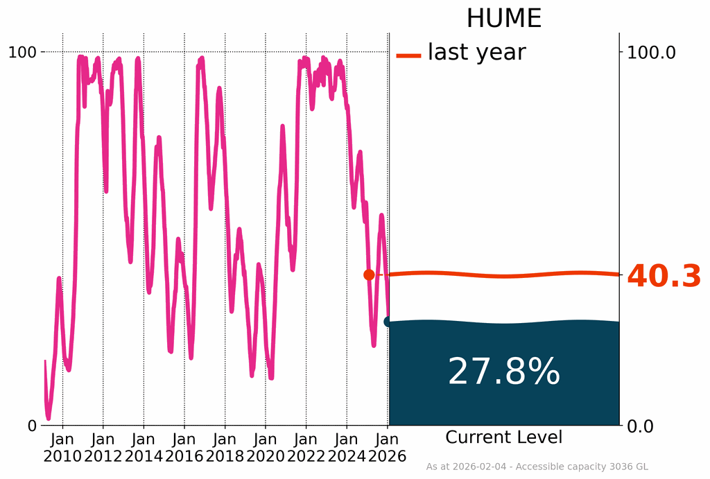 Many storages across the Murray–Darling Basin and the South East Coast (Victoria) drainage division were below or close to 50% of capacity at the end of January, including Hume Dam, Australia’s seventh-largest reservoir, and Lake Eucumbene. Hume Dam decreased by 7.7% during January, finishing at 27.8%, 12.5% lower than at the same time last year. Menindee Lakes in the west of New South Wales, decreased to 38.8% at the end of January.