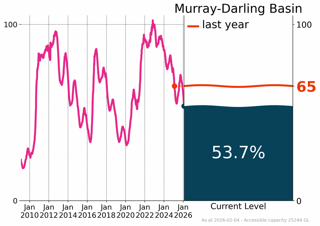 The overall storage volume across the Murray–Darling Basin decreased by 7.4% during January, finishing the month at 53.7% and 11.3% lower than at the same time last year. With dry catchment conditions and increased demand during the irrigation season (October to March), the storage volume decreased in 15 of the 33 storages across the southern Murray–Darling Basin.