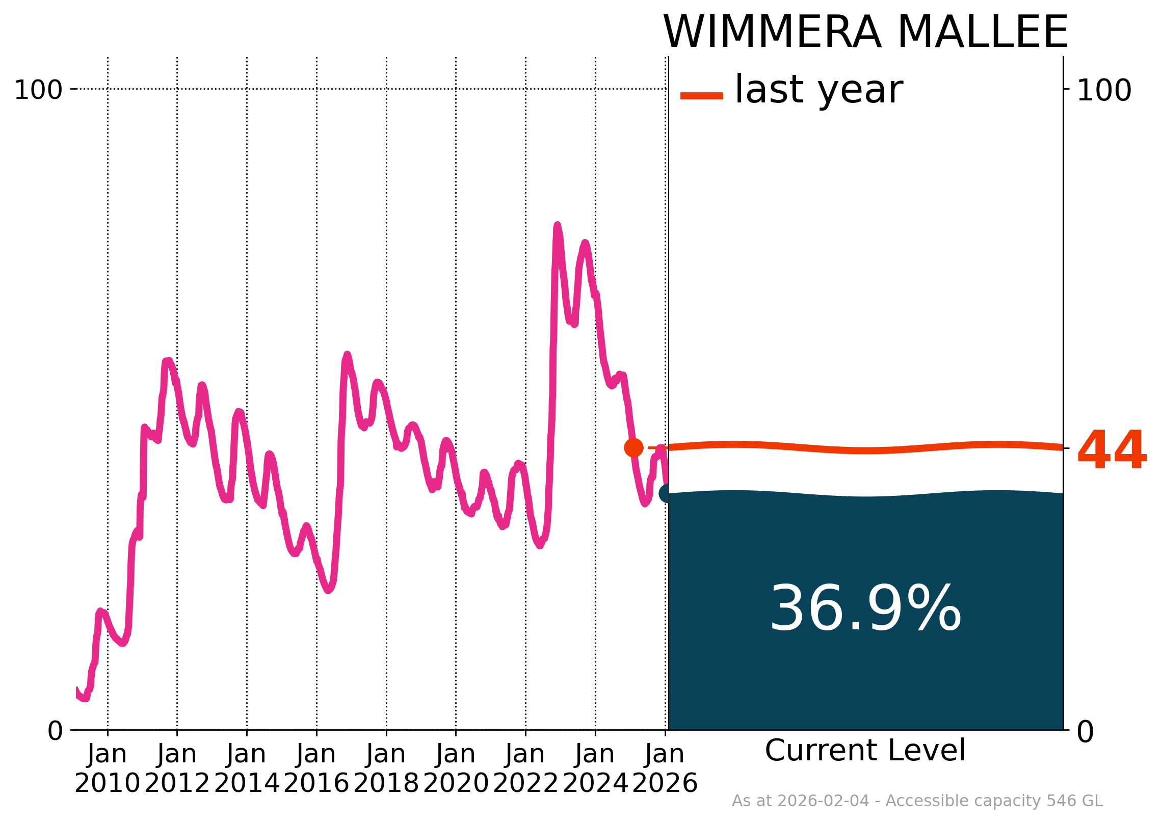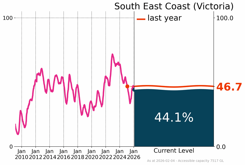 Overall storage volume across the South East Coast (Victoria) drainage division slightly decreased by 2.4% in January, ending the month at 44.1%. In the Wimmera–Mallee system, a critical rural water supply for domestic and agricultural use in western Victoria, storages were at 36.9% of capacity, down by 4.0% compared to the previous month and 7.1% lower than at the same time last year.