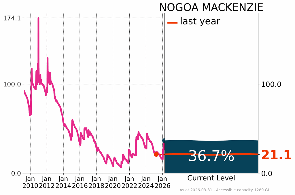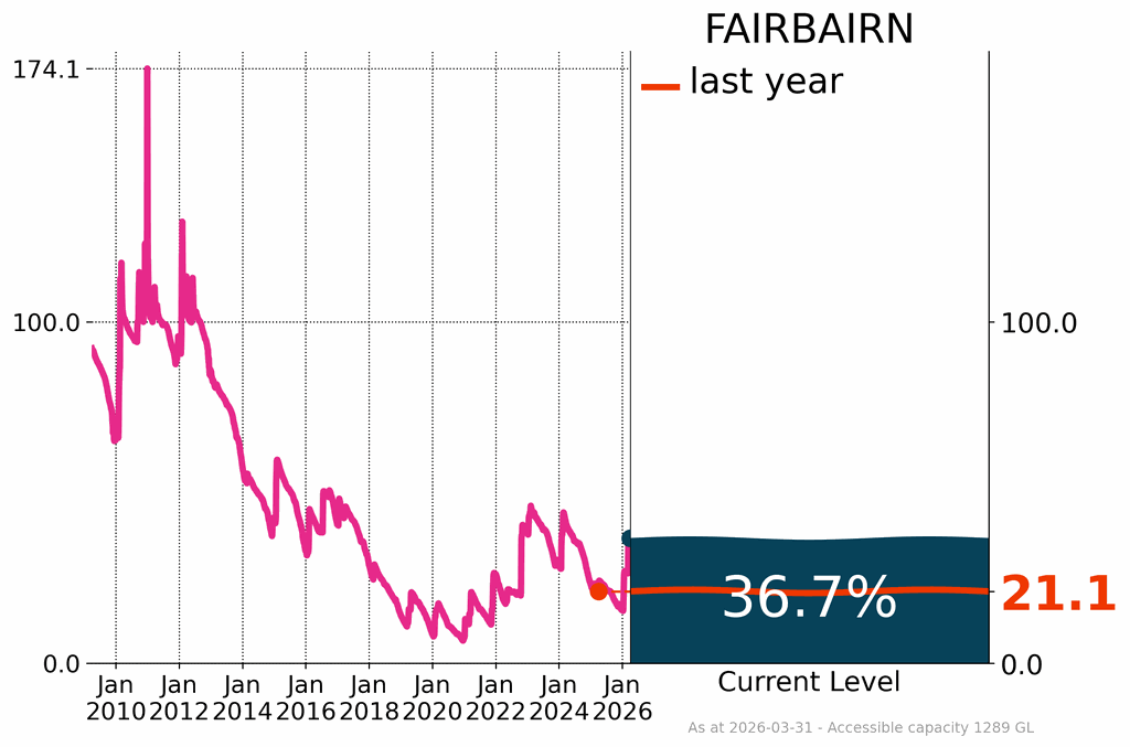 Storage in Fairbairn Dam increased by 9.9%, finishing the month at 36.7%. This increase at Fairbairn raised the volumes in the Nogoa-Mackenzie system to 36.7% of capacity in March. The Nogoa–Mackenzie system supplies water to rural communities across central Queensland.