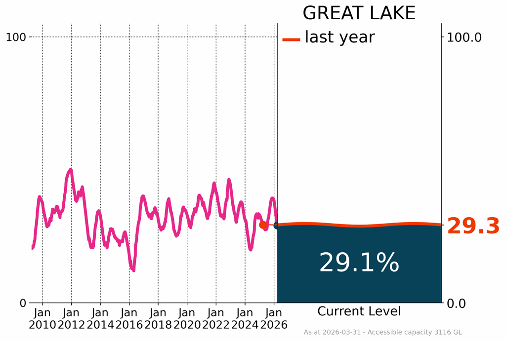 In Tasmania, the two largest storages—Lake Gordon and Great Lake—were at 61.4% and 29.1%, respectively, at the end of March. Total storage across Tasmania was 64.0%, a decrease of 2.5% from February, but 5.0% higher than this time last year.