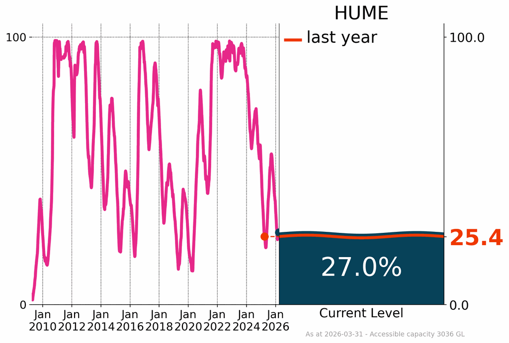 Many storages across the Murray–Darling Basin and the South East Coast (Victoria) drainage divisions were below or close to 50% of capacity at the end of March, including Hume Dam, Australia’s seventh-largest reservoir, and Lake Eucumbene. Hume Dam increased by 2.1% during March, finishing at 27.0%, and 1.6% higher than at the same time last year. Menindee Lakes in western New South Wales decreased by 4.2%, finishing at 28.5% of capacity at the end of March.