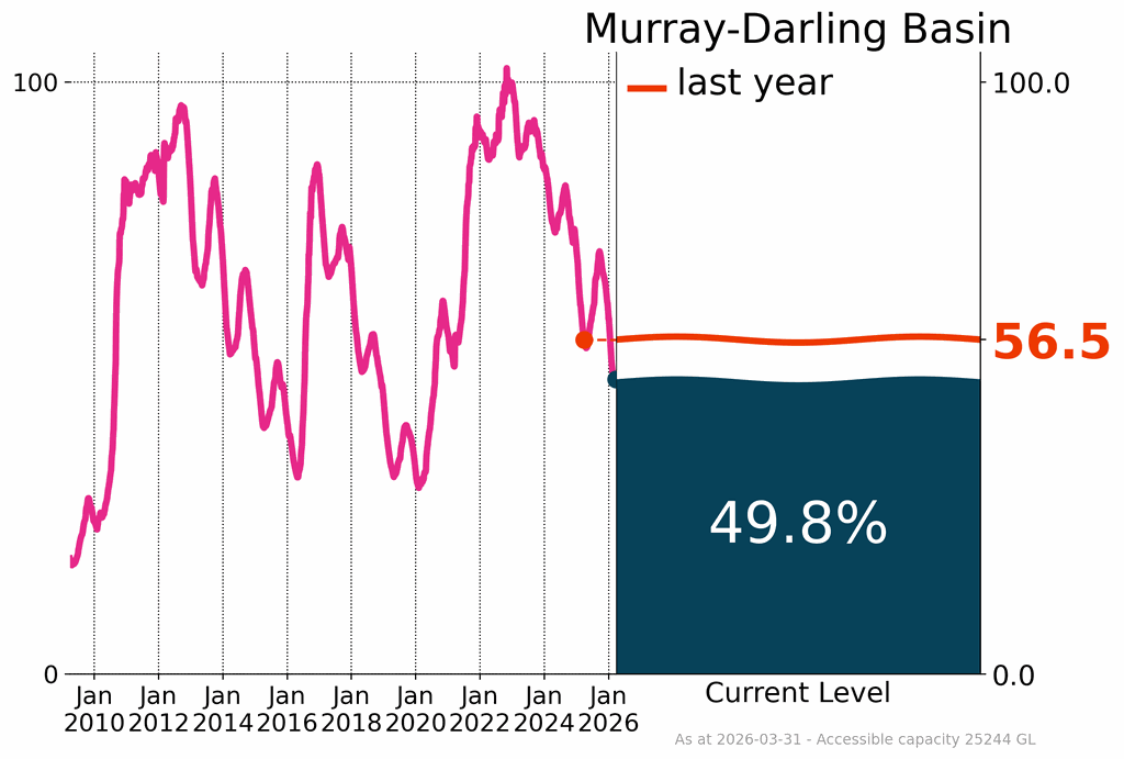 The overall storage volume across the Murray–Darling Basin slightly decreased by 0.4% during March, finishing the month at 49.8%, 6.7% lower than at the same time last year. With dry catchment conditions and increased demand during the irrigation season (October to March), the storage volume in the southern Murray–Darling Basin slightly decreased by 0.7% over the month, finishing at 47.9% capacity at the end of March, around 8.3% lower than at the same time last year.