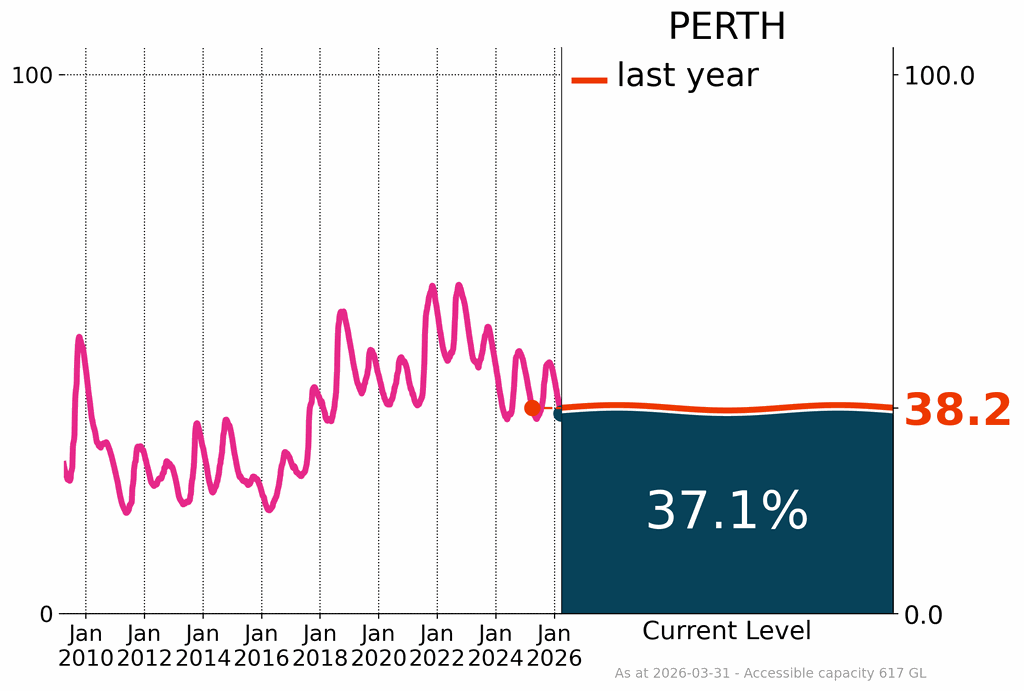 Perth’s surface water storages were at 37.1% of capacity at the end of March, a decrease of 2.1% from the previous month, and 1.1% lower than at the same time last year. The two largest storages supplying Perth remained below 35% capacity, with South Dandalup at 7.3% and Serpentine at 31.2%.