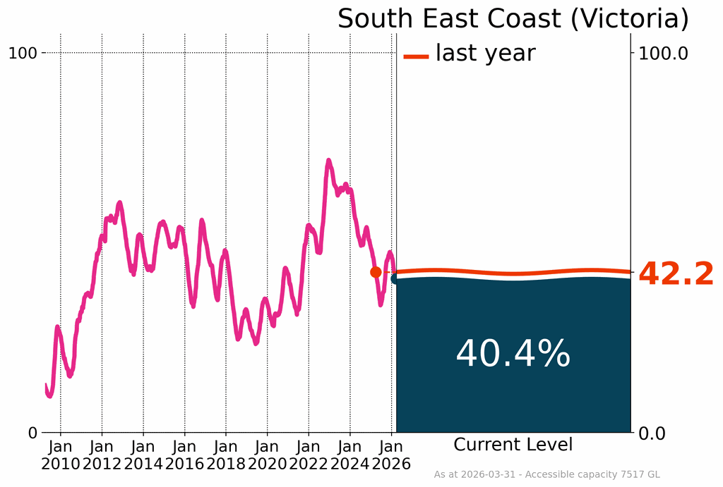 Declines in storages in eastern New South Wales and south-eastern Queensland were generally due to below average rainfall and increased water demand. Although average to above average rainfall during March, extremely dry conditions since 2023 in Victoria have led to reduced inflows to the storages and large volumes were used for agriculture during the spring and summer high-demand period. Extended dry spells over many years have kept storages low in south-west Western Australia.