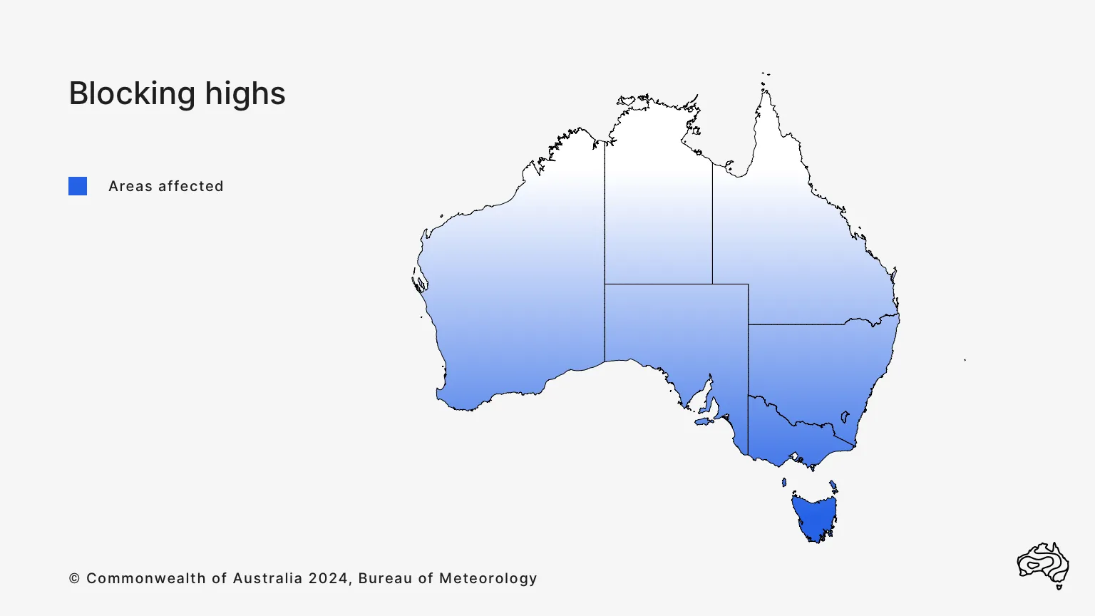 Blocking highs can affect all of southern Australia. They can happen at any time of year, lasting from several days to several weeks.