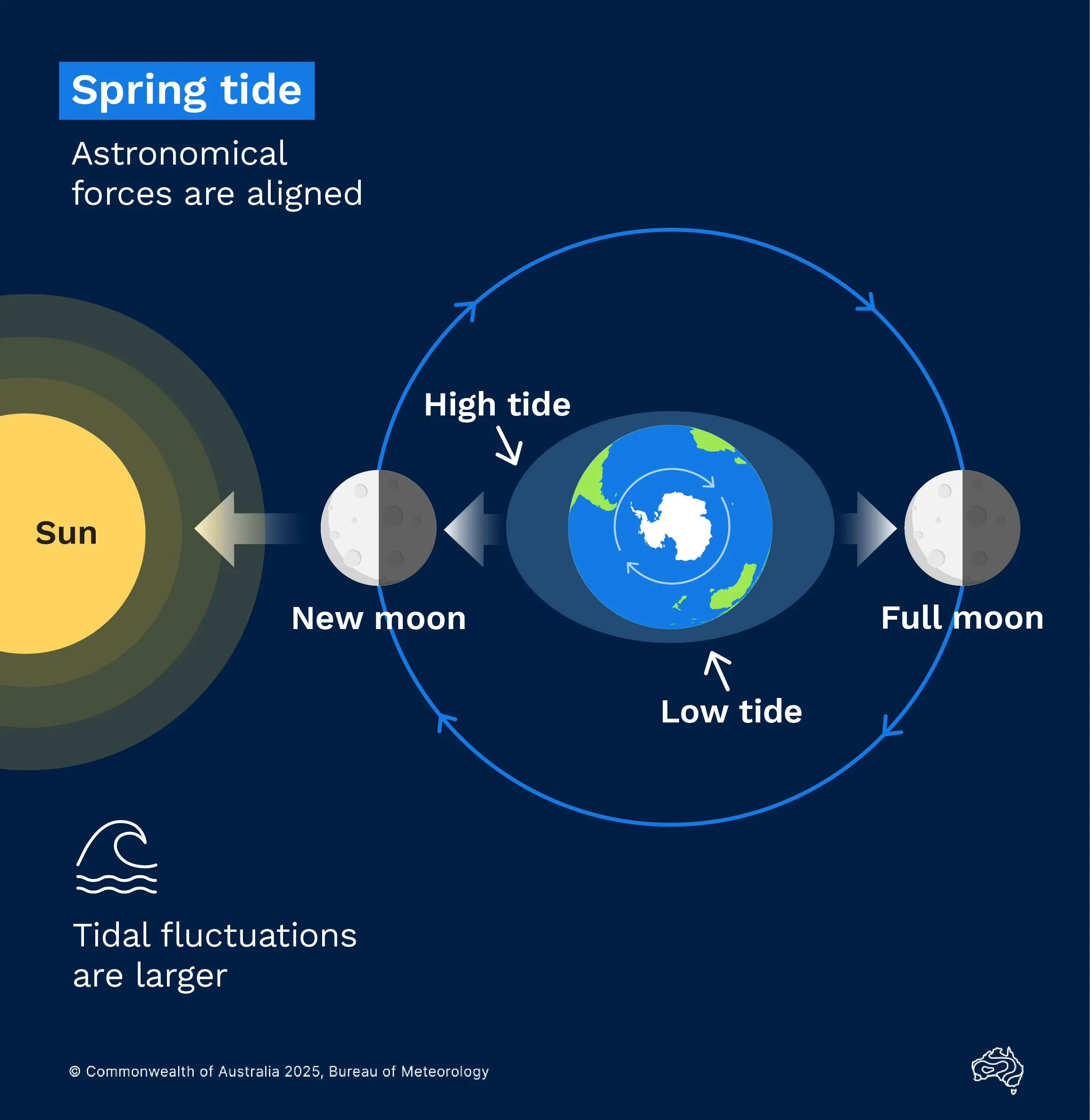 Spring high tides are a little higher than average. Spring low tides are a little lower than average.