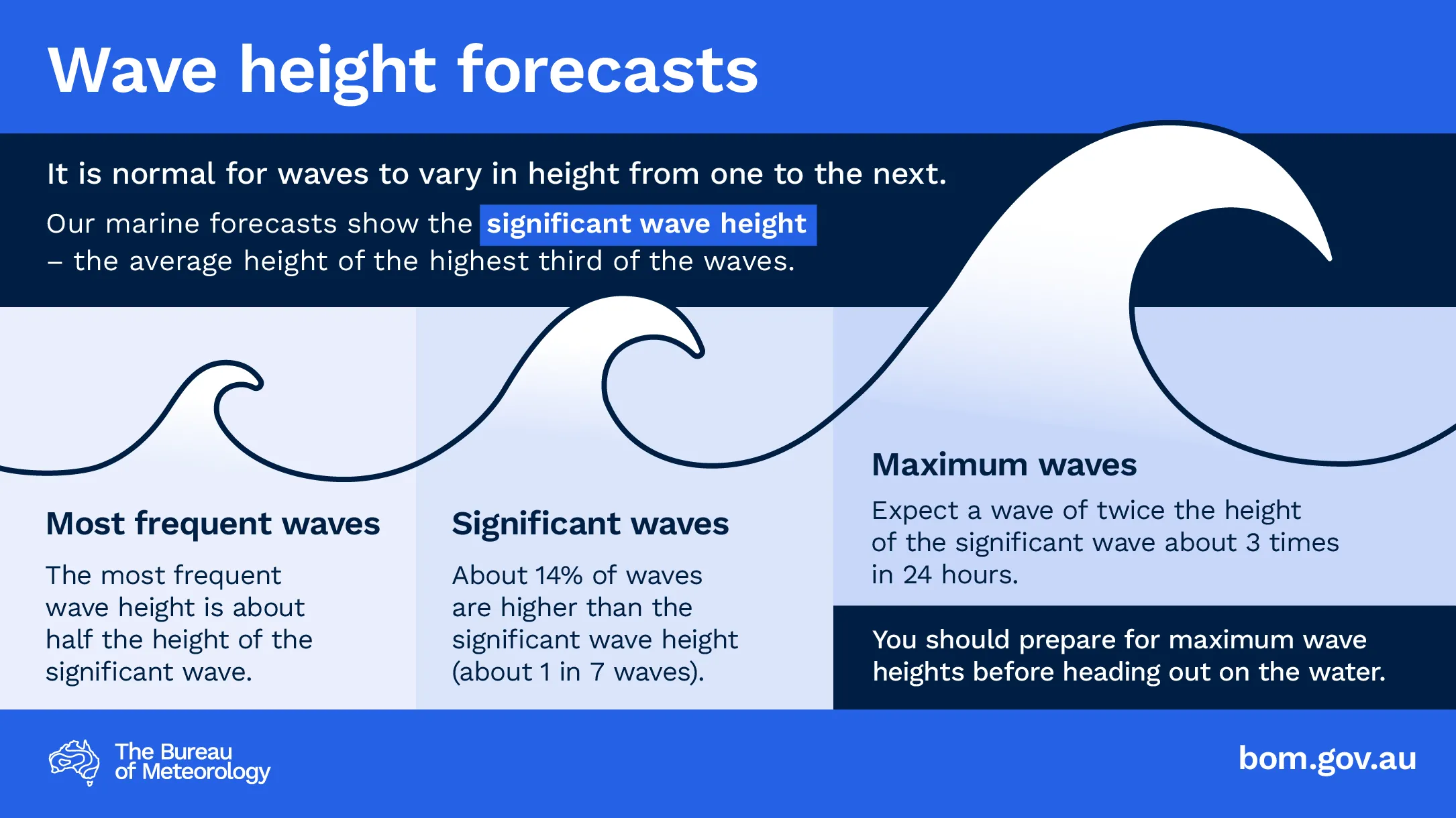 We do not forecast maximum wave heights in routine forecasts. About one in every 2000–3000 waves (3–4 times a day) will be about twice the total wave height. Be prepared for a wave of this height before going out on the water.