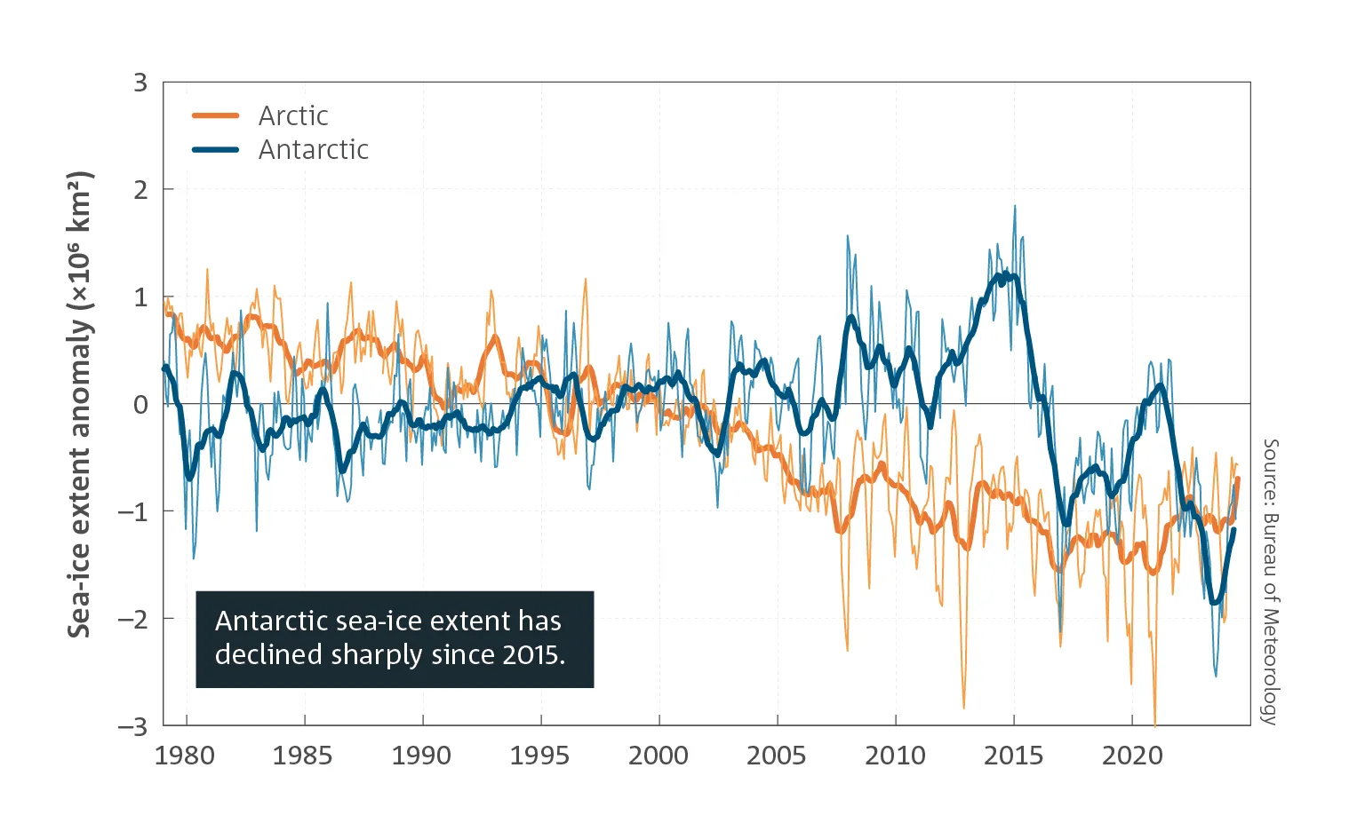 The overall increase in Antarctic sea-ice extent from 1979 to 2014 has largely been attributed to changes in westerly wind strength, whereas the marked decrease since 2015 has been attributed to a combination of atmospheric and oceanic anomalies. The primary influence on low sea-ice growth in recent years, particularly in 2023 and 2024, has been abnormally warm subsurface temperatures in the Southern Ocean, with additional impacts from anomalies caused by large-scale weather patterns across the region.