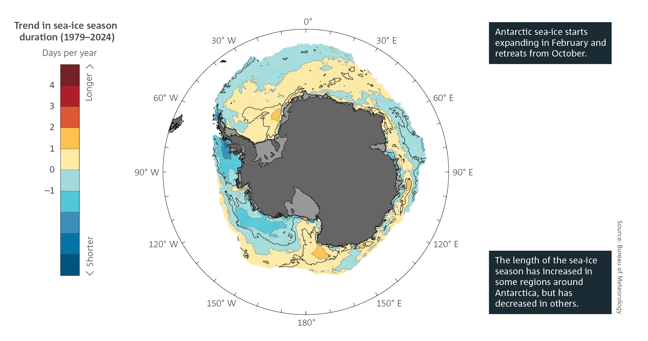 Trends in the length of the sea-ice season each year (in days per year) around Antarctica, from 1979–1980 to 2023–2024. Each year, sea ice around Antarctica starts expanding in February and retreats from October. Duration is a measure of the number of days that a particular location is covered by sea ice.