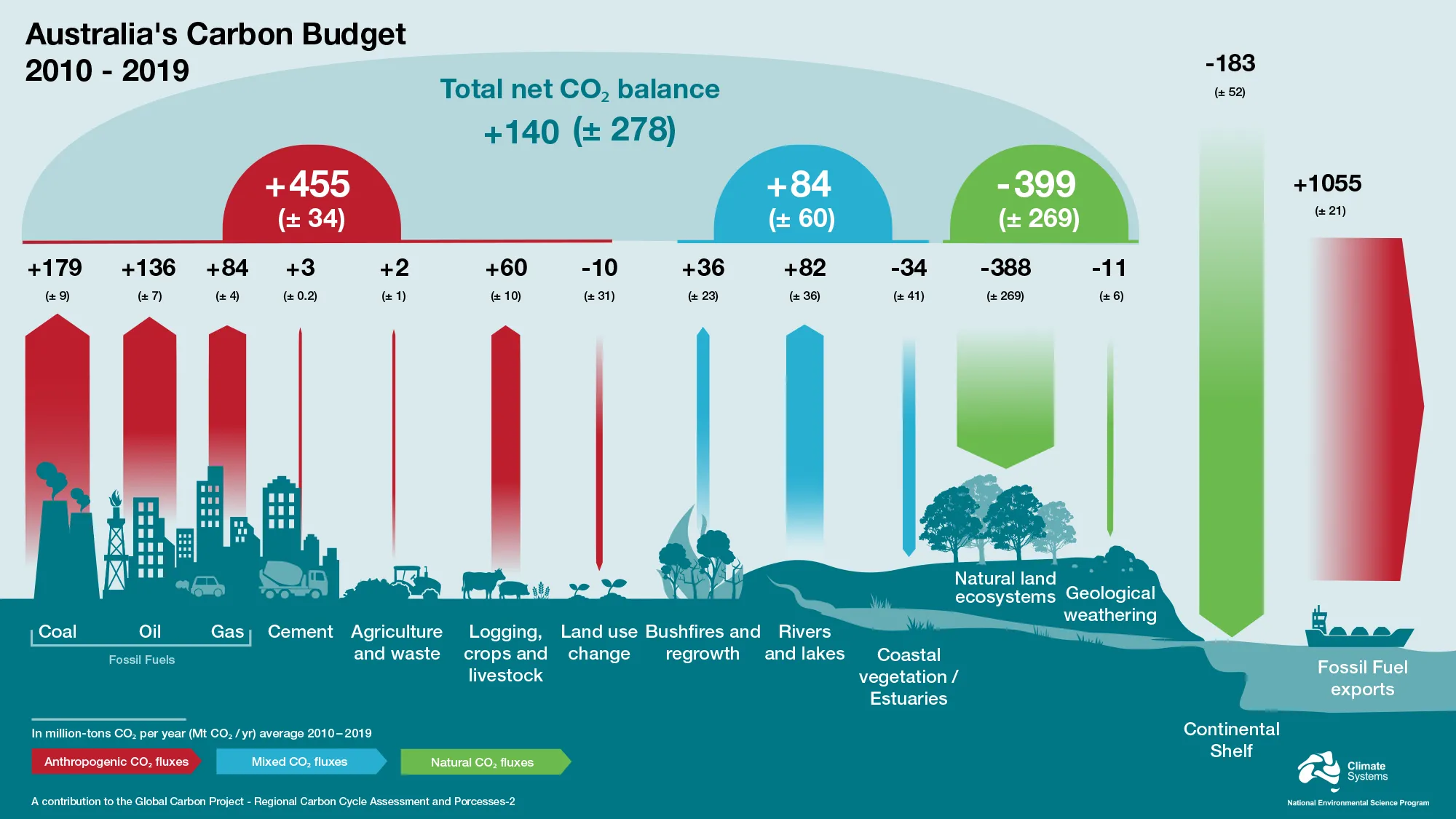 Illustration showing Australia’s carbon budget between 2010 and 2019. Average annual emissions from fossil fuels during the period were 455 Mt (± 34 Mt). Natural ecosystems absorbed on average 399 Mt per year (± 269 Mt). Australian fossil fuel exports contributed an annual average of 1,055 Mt (± 21 Mt).