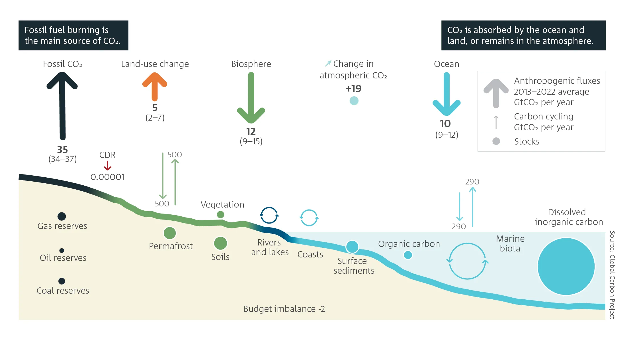 Perturbation of the global carbon budget caused by anthropogenic activities, global annual average for the decade 2013–2022 (GtCO2 per year). Vertical arrows indicate CO2 fluxes in or out of the atmosphere; the sum of all sources does not match the sum of all sinks because of estimate uncertainties and number rounding. Circle arrows indicate lateral transport or redistribution without an earth component. Solid circles indicate the size of the carbon stocks in GtC. Figure adapted from Friedlingstein et al. (2023).