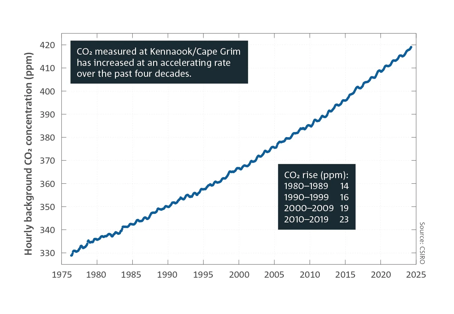The Kennaook / Cape Grim Baseline Air Pollution Station, located at the north-west tip of Tasmania, is the Southern Hemisphere’s key greenhouse gas monitoring station in the World Meteorological Organization’s Global Atmosphere Watch program. It has been running continuously for 48 years.