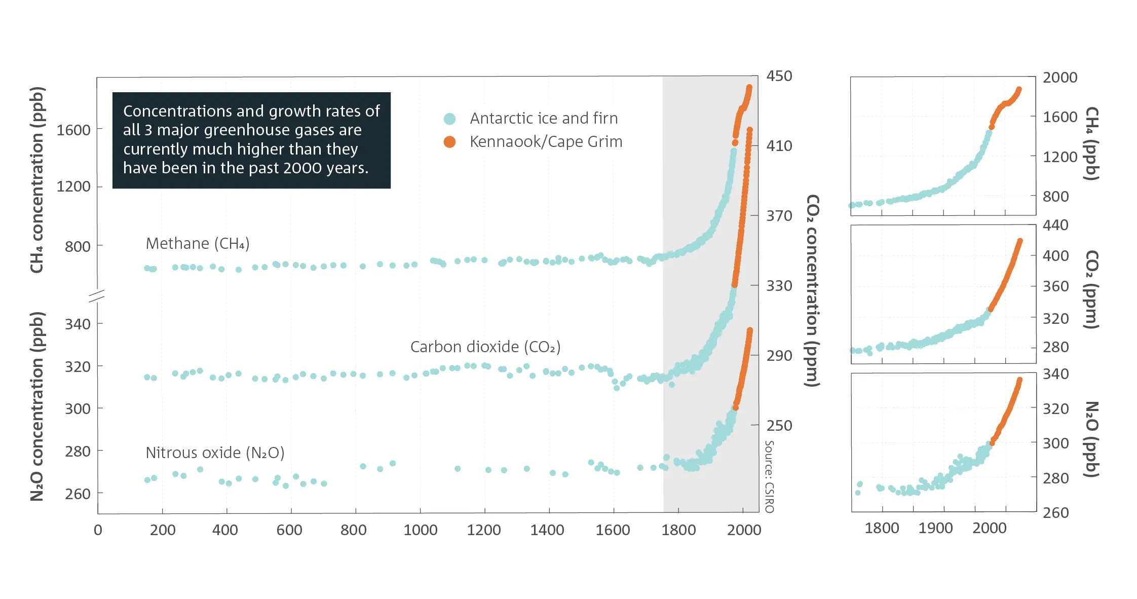 Concentrations of the major greenhouse gases (CO2, methane and nitrous oxide) in the atmosphere over the past 2000 years. Blue data are measured from air extracted from Antarctic ice cores and the overlying compressed snow (firn) layer. Orange data show the modern in situ record measured at Kennaook / Cape Grim Baseline Air Pollution Station. Note the different scales used for the concentration of each gas.
